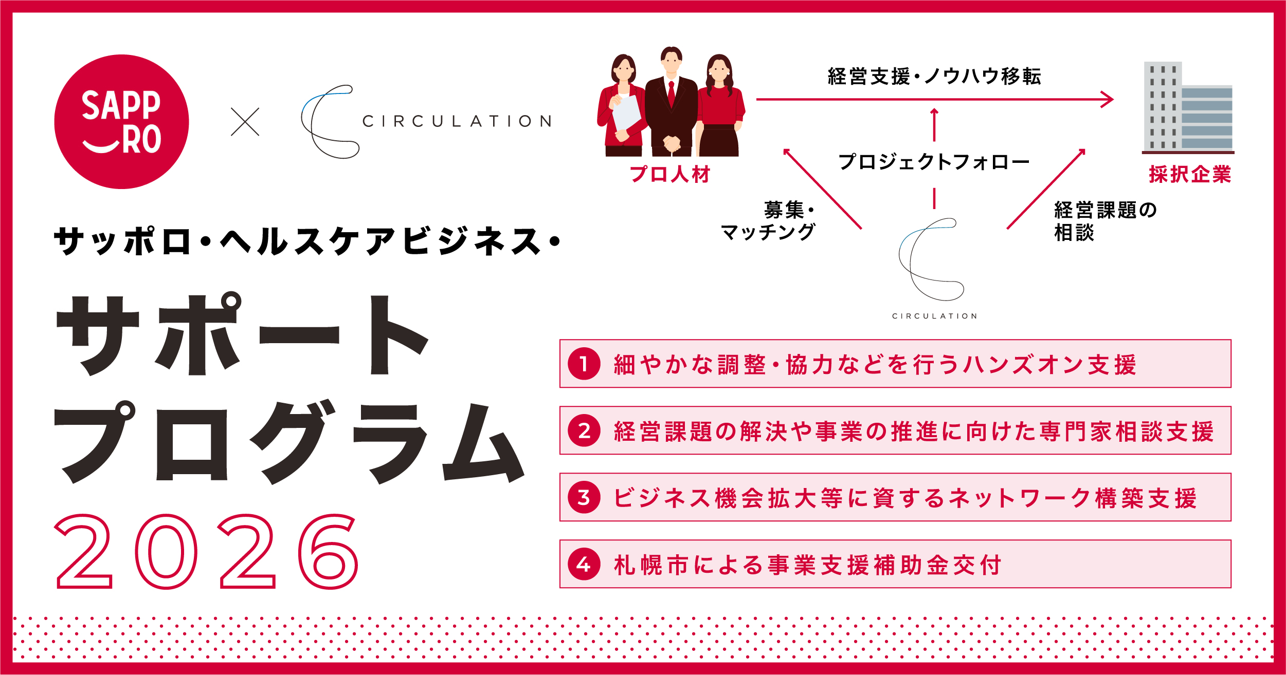 30,000名以上のプロ人材の経験・知見を複数の企業でシェアし、経営課題を解決するプロシェアリング事業を運営する株式会社サーキュレーション(所在地:東京都渋谷区、代表取締役社長:福田 悠、以下サーキュレーション)は、札幌市経済観光局より、ヘルスケア関連企業の事業化支援を目的とした「サッポロ・ヘルスケアビジネス・サポートプログラム2026」運営業務(以下、本事業)を受託しました。これにより、北海道支社を中心に、首都圏等のプロフェッショナル人材と市内企業との共創を生み出し、札幌市の重点分野であるヘルスケア産業の成長を強力に支援します。