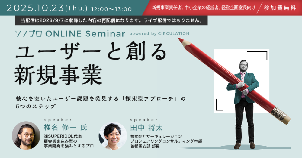 当日は事例も交え、ユーザーを巻き込んで顧客課題と解決策を特定する、椎名氏の仮説検証法を語っていただきます。